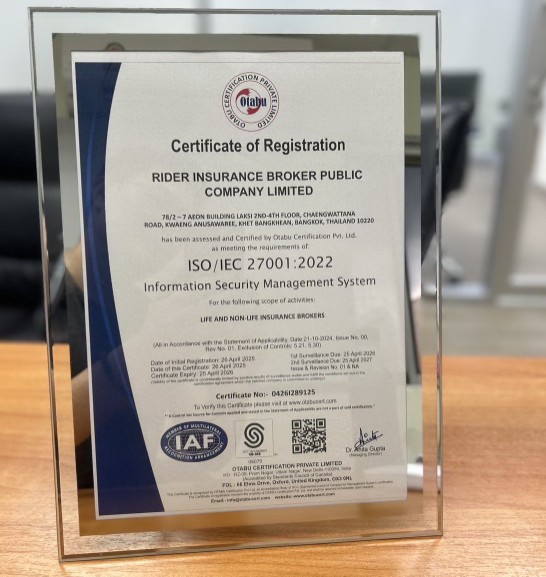 บมจ.ไรเดอร์ อินชัวรันส์ โบรกเกอร์ ได้รับการรับรองมาตรฐาน ISO 27001:2022 ยกระดับความปลอดภัยด้านข้อมูล พร้อมมุ่งหน้าสู่การเป็นผู้นำในตลาด Insur tech