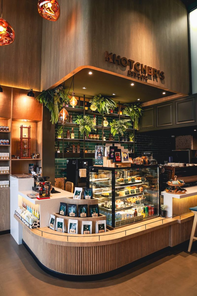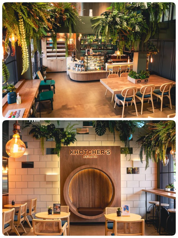 “Khotcher’ s Cafe” ตั้งอยู่ในโครงการ เมโทร บิซทาวน์ เส้นสะพานพระราม 4 – ย่านราชพฤกษ์ จ.นนทบุรี เป็นโครงการทาวน์โฮม ทำเลย่านธุรกิจ การตบแต่งคาเฟ่สไตล์ modern luxury บรรยากาศข้างในหลังจากเข้ามาถึงคาเฟ่แล้วให้ความรู้สึก warm & cozy ด้วยสีเขียวเอิรธ์โทน และ สีดำ เฟอร์นิเจอร์ตบแต่งเป็นลายไม้ขัดเรียบ สีสว่าง สะอาดตา เป็นการตั้งใจออกแบบโดย คุณ กมลรัตน์ เต็งมณี เจ้าของร้าน