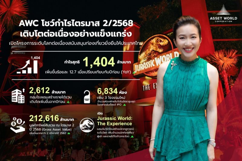 AWC มุ่งมั่นเดินหน้าสร้างการเติบโต ด้วยผลประกอบการไตรมาส 2/2568 กำไรสุทธิที่ 1,404 ล้านบาท เพิ่มขึ้น 12.7% (YoY) พร้อมเปิดประสบการณ์พิเศษ “Jurassic World: The Experience” สนับสนุนท่องเที่ยวยั่งยืนให้ประเทศไทย