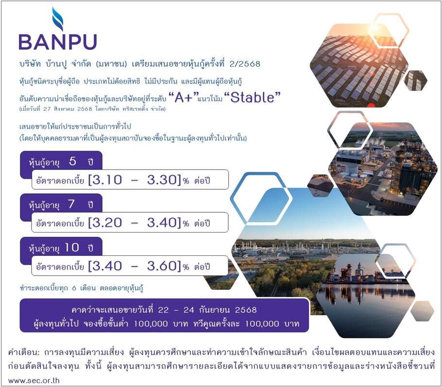 บริษัท บ้านปู จำกัด (มหาชน) ผู้นำด้านพลังงานที่หลากหลาย เตรียมออกและเสนอขายหุ้นกู้ให้แก่ประชาชนเป็นการทั่วไป (Public Offering) จำนวน 3 ชุด ผ่าน 7 สถาบันการเงินชั้นนำ โดยหุ้นกู้ได้รับการจัดอันดับเครดิตจากทริสเรทติ้งที่ระดับ “A+” แนวโน้ม “คงที่” เมื่อวันที่ 27 สิงหาคม พ.ศ. 2568