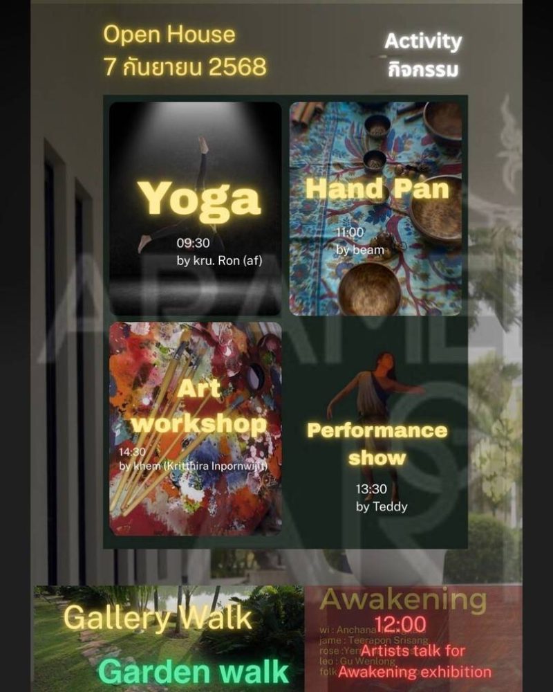 นอกจากกิจกรรมด้านศิลปะแล้ว ยังมีการสนทนาธรรมกับพระอาจารย์สุรศักดิ์ จรณธัมโม เพื่อให้ความรู้และสร้างความเข้าใจที่ลึกซึ้งยิ่งขึ้นเกี่ยวกับการเจริญสติอีกด้วย งานนี้จึงเป็นโอกาสอันดีสำหรับผู้ที่ต้องการหาสถานที่พักผ่อนกายและใจ พร้อมรับแรงบันดาลใจในการใช้ชีวิตอย่างมีสติ