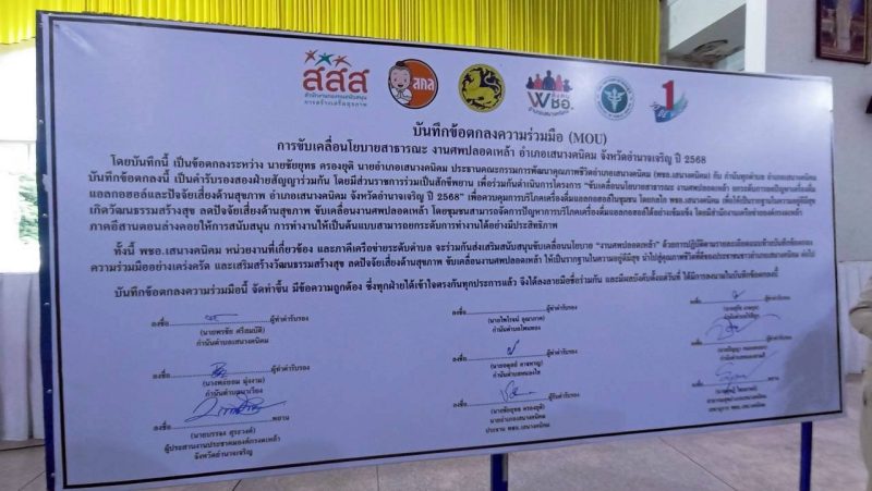 ขณะที่นายบรรจง สุระวงศ์ ผู้ประสานงานเครือข่ายงดเหล้า ได้กล่าวถึงทิศทางการขับเคลื่อนในเชิงนโยบายว่า การลงนาม MOU ในครั้งนี้เกิดขึ้นใน 2 อำเภอ คือ อำเภอเสนางคนิคม และอำเภอชานุมาน โดยมีแนวทางการดำเนินงาน 3 ระยะ คือ (1.) การสื่อสารเชิงรุก ประกาศและประชาสัมพันธ์ให้ชุมชนทุกหมู่บ้านรับรู้และร่วมกันขับเคลื่อน เริ่มต้นจาก “งานศพปลอดเหล้า” (2.) การเก็บข้อมูลและสะท้อนผลลัพธ์ เช่น จำนวนงานศพที่จัดแบบปลอดเหล้า และค่าใช้จ่ายที่ลดลง เพื่อแสดงให้เห็นผลที่เป็นรูปธรรม (3.) การติดตาม ประเมินผล และเชิดชูต้นแบบ โดยยกย่องเจ้าภาพที่จัดงานศพปลอดเหล้า เพื่อสร้างแรงบันดาลใจและต่อยอดสู่วัฒนธรรมงานบุญปลอดเหล้าในอนาคต โดยผลสำรวจเกี่ยวกับสถานการณ์การดื่มเครื่องดื่มที่มีแอลกอฮอล์ จากสำนักงานสถิติแห่งชาติ ปี 2567 ระบุว่า อำนาจเจริญมีความชุกนักดื่มกว่าร้อยละ 40.1 เกินกว่าค่าเฉลี่ยประเทศที่ระดับ 35.2 รวมทั้งปัญหาในเด็กเยาวชนซึ่งการเปลี่ยนแปลงค่านิยมงานศพจะเป็นส่วนหนึ่งในการแก้ปัญหาในระยะยาว ซึ่งจากการศึกษาพบว่าค่าเหล้าในงานเฉลี่ยประมาณ ร้อยละ 30 ของค่าใช้จ่ายทั้งหมด ซึ่งโดยปกติงานศพในพื้นที่จัดประมาณ 3-5 คืน มีค่าใช้จ่ายขั้นต่ำประมาณ 1 แสนบาท ซึ่งหากประหยัดค่าเหล้าจะลดได้กว่า 30,000 บาท