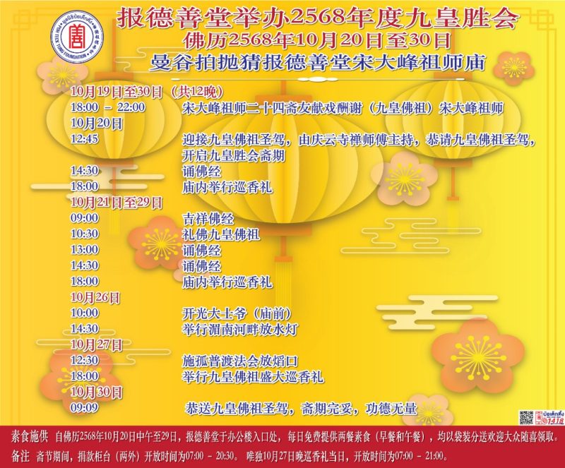 นอกจากนี้ ระหว่างวันที่ 19 – 30 ตุลาคม 68 ขอเชิญชวนประชาชนชมอุปรากรจีน (งิ้ว) ที่คณะลูกศิษย์หลวงปู่ไต้ฮงจัดถวายรวม 12 คืน ณ บริเวณฝั่งสำนักงาน มูลนิธิป่อเต็กตึ๊ง พลับพลาไชย กรุงเทพฯ