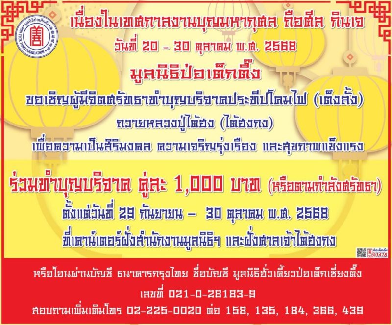 ระหว่างวันที่ 20 – 29 ตุลาคม 2568 มูลนิธิป่อเต็กตึ๊ง จัดให้มีบริการอาหารเจ [บรรจุใส่ถุง] แก่ประชาชนฟรี วันละ 2 มื้อ (มื้อเช้า และ กลางวัน) โดยเริ่มบริการตั้งแต่มื้อกลางวันของวันที่ 29 ตุลาคม ณ บริเวณทางเข้าสำนักงานมูลนิธิฯ ทั้งนี้ มูลนิธิฯ ขอความกรุณาประชาชนผู้เข้ารับบริการอาหารเจนำถุงหิ้ว/ถุงผ้ามาบรรจุอาหารด้วยทุกครั้ง