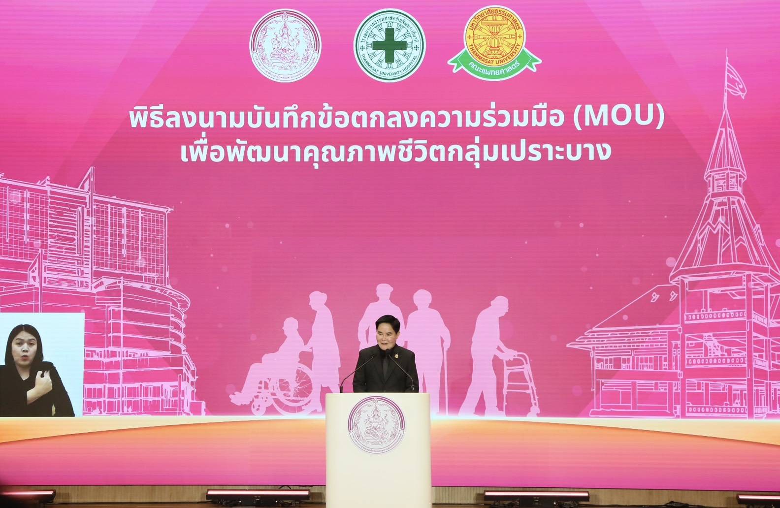 นายอัครา กล่าวต่อไปว่า วันนี้ การลงนามในบันทึกข้อตกลงความร่วมมือ (MOU) “โครงการบูรณาการความร่วมมือเพื่อพัฒนาคุณภาพชีวิตกลุ่มเปราะบาง” ระหว่างกระทรวงการพัฒนาสังคมและความมั่นคงของมนุษย์ กับโรงพยาบาลธรรมศาสตร์เฉลิมพระเกียรติ และคณะแพทยศาสตร์ มหาวิทยาลัยธรรมศาสตร์ นั้น นับเป็นตัวอย่างของการนำ นโยบายระดับชาติมาผสานกับ ศักยภาพระดับพื้นที่ระหว่างภารกิจด้านสังคมของกระทรวง พม. และศักยภาพด้านการแพทย์ของมหาวิทยาลัยธรรมศาสตร์ เพื่อให้ประชาชน โดยเฉพาะกลุ่มเปราะบางได้รับโอกาสในการรักษา ฟื้นฟู และกลับมามีคุณภาพชีวิตที่ดีขึ้น โดยไม่ต้องแบกรับภาระเกินความจำเป็น คือความร่วมมือที่มี “ผลลัพธ์จับต้องได้” ต่อกลุ่มเปราะบาง ความร่วมมือที่เราลงนามกันในวันนี้เป็นตัวอย่างของการนำ นโยบายระดับชาติมาผสานกับศักยภาพระดับพื้นที่ระหว่างภารกิจด้านสังคมของกระทรวง พม. และศักยภาพด้านการแพทย์ของมหาวิทยาลัยธรรมศาสตร์ เพื่อให้ประชาชนได้รับโอกาสในการรักษา ฟื้นฟู และกลับมามีคุณภาพชีวิตที่ดีขึ้น โดยไม่ต้องแบกรับภาระเกินความจำเป็น ซึ่งคือความร่วมมือที่มี “ผลลัพธ์จับต้องได้” ต่อประชาชนกลุ่มเปราะบาง และสิ่งที่สำคัญที่สุด คือ ความร่วมมือนี้ จะไม่หยุดเพียงการผ่าตัด หรือการรักษาเฉพาะหน้า แต่จะเป็นฐานสำคัญของการพัฒนาระบบการดูแลผู้สูงอายุในระยะยาวของประเทศเพื่อรองรับสังคมสูงวัยที่กำลังเป็นความท้าทายสำคัญของประเทศไทย