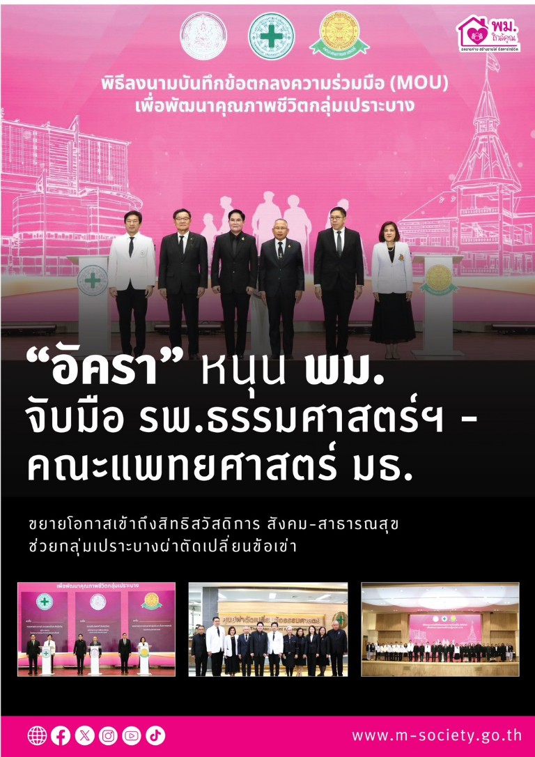 นายอัครา พรหมเผ่า รัฐมนตรีว่าการกระทรวงการพัฒนาสังคมและความมั่นคงของมนุษย์ (รมว.พม.) เป็นประธานในพิธีลงนามบันทึกข้อตกลงความร่วมมือ (MOU) เพื่อพัฒนาคุณภาพชีวิตกลุ่มเปราะบาง” ระหว่างกระทรวงการพัฒนาสังคมและความมั่นคงของมนุษย์ กับโรงพยาบาลธรรมศาสตร์เฉลิมพระเกียรติ และคณะแพทยศาสตร์ มหาวิทยาลัยธรรมศาสตร์ โดยมี ศาสตราจารย์ ดร.ศุภสวัสดิ์ ชัชวาลย์ อธิการบดีมหาวิทยาลัยธรรมศาสตร์ กล่าวต้อนรับ และศาสตราจารย์ ดร.สุรพล นิติไกรพจน์ นายกสภามหาวิทยาลัยธรรมศาสตร์ กล่าวแสดงเจตจำนงความร่วมมือ ทั้งนี้ นายกันตพงศ์ รังษีสว่าง ปลัดกระทรวงการพัฒนาสังคมและความมั่นคงของมนุษย์ (ปลัด พม.) , รองศาสตราจารย์ นายแพทย์ดิลก ภิยโยทัย ผู้อำนวยการโรงพยาบาลธรรมศาสตร์เฉลิมพระเกียรติ และรองศาสตราจารย์ แพทย์หญิงอัจฉรา ตั้งสถาพรพงษ์ คณบดีคณะแพทยศาสตร์ มหาวิทยาลัยธรรมศาสตร์ ร่วมลงนาม ณ ศูนย์ประชุมคณะแพทยศาสตร์ ชั้น 8 ศูนย์ฝึกทักษะทางการแพทย์ธรรมศาสตร์ (TMEd) มหาวิทยาลัยธรรมศาสตร์ ศูนย์รังสิต จังหวัดปทุมธานี