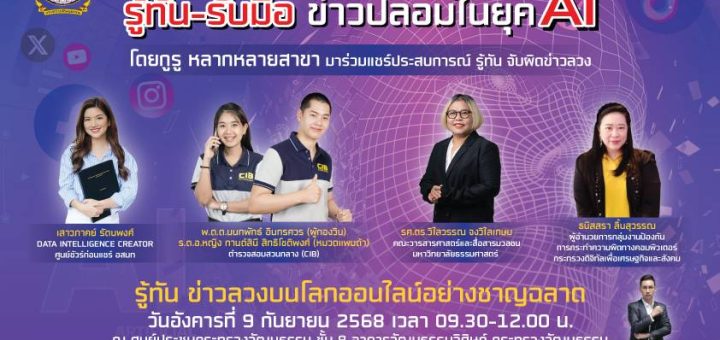 วธ. ชวนเยาวชนร่วมงานเสวนา “Fact or Fake?” รู้ทัน – รับมือข่าวปลอมในยุค AI สร้างการรู้เท่าทันสื่อ – ข่าวปลอม รับมือความท้าทายในยุคดิจิทัล กระทรวงวัฒนธรรม โดยกองเฝ้าระวังทางวัฒนธรรม เดินหน้ …[อ่านข่าวเพิ่มเติม]