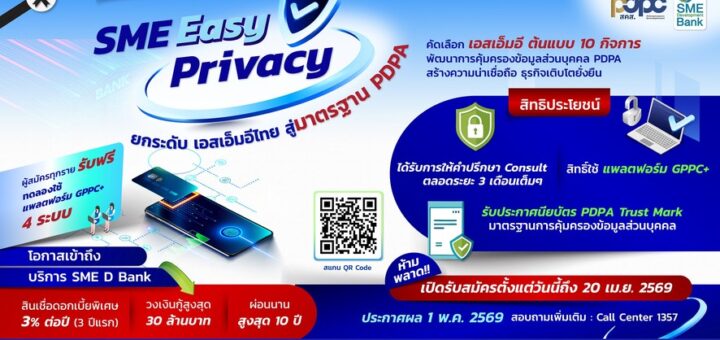 SME D Bank จับมือ สคส. เดินหน้าโครงการ “SME Easy Privacy” สร้างรากฐานเศรษฐกิจดิจิทัลเข้มแข็ง เปิดคัดเลือกหาเอสเอ็มอี 10 กิจการ เพื่อเป็นต้นแบบธุรกิจแข็งแกร่งและเติบโตด้วยมาตรฐานข้อมูลส่วนบุคคลตามกฎหมาย (PDPA) ยกระดับธุรกิจสู่เศรษฐกิจดิจิทัล เผยรับสมัครตั้งแต่วันนี้ถึง 20 เม.ย.69