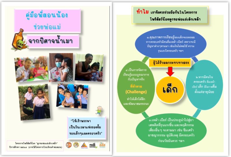 น.ส.อภิศา มะหะมาน ผู้รับผิดชอบโครงการ กล่าวว่า โรงเรียนได้มีการนำคู่มือแบบง่าย ที่ทางโครงการออกแบบไว้ไปใช้เป็นสื่อในการเรียนการสอนตามแนวทาง Active Learning โดยมีจุดเด่นคือ นักเรียนรุ่นพี่ สอนนักเรียนรุ่นน้อง ทำกิจกรรม 10 อย่าง ที่ช่วยทำให้มีความรับผิดชอบและกล้าแสดงออก ได้แก่ พี่สอนน้องท่องความดี , พี่สอนน้องเรียนคณิตคิดค่าเหล้า , พี่สอนน้องเอาตับแช่เหล้า , พี่สอนน้องเขียนจดหมายสื่อรักขอพ่อแม่เลิกเหล้า , พี่สอนน้องสอนออมสินสื่อรักพิทักษ์ครอบครัว และพี่สอนน้องทำแปลงผักสื่อรัก เป็นต้น โดยมีครูเป็นพี่เลี้ยง ซึ่งสิ่งเหล่านี้ไม่ค่อยมีจากต้นสังกัดที่มีคู่มือและสื่อการสอนมาพร้อม ทั้งนี้เมื่อปี 2567 ซึ่งมีผู้ปกครองร่วมงดเหล้า 14,590 คน ครูและผู้บริหารร่วมลดละเลิกกว่า 4,866 คน นักเรียนเข้าร่วม 25,811 คน ส่วนปีนี้คาดว่า จะมีการดำเนินงานที่เพิ่มมากขึ้น มีครอบครัวที่มีความสุขมีสติมากขึ้นพร้อมสู้กับภัยวิกฤตสังคมได้ดีมากขึ้น