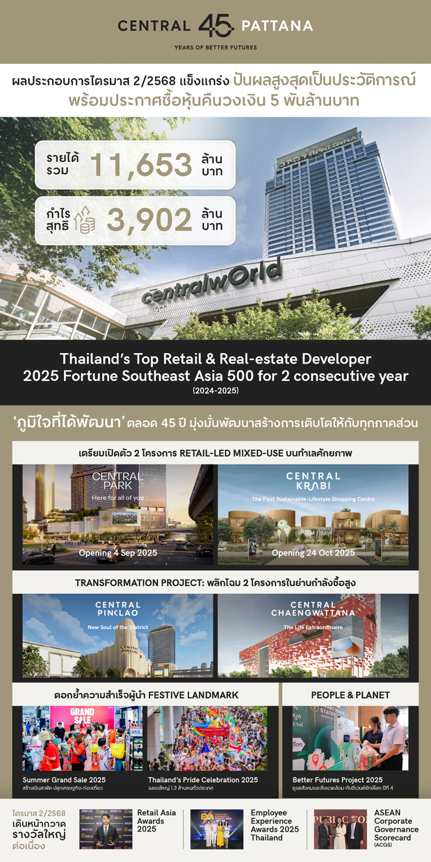 กรุงเทพฯ: บริษัท เซ็นทรัลพัฒนา จำกัด (มหาชน) เปิดผลประกอบการไตรมาส 2 ปี 2568 เติบโตแข็งแกร่งต่อเนื่องจากธุรกิจศูนย์การค้า บริษัทฯ มีรายได้รวม 11,653 ล้านบาทโต 3% และกำไรสุทธิ 3,902 ล้านบาท โต 10% จากปีก่อน (ไม่รวมธุรกิจอสังหาริมทรัพย์) โดยในไตรมาส 2 นี้ บริษัทฯ ได้ดำเนินการจ่ายเงินปันผล 2.10 บาทต่อหุ้น ซึ่งสูงสุดเป็นประวัติการณ์ สะท้อนฐานะทางการเงินที่แข็งแกร่งด้วยอัตรา ภาระหนี้สินต่อทุนที่ปรับตัวดีขึ้นเรื่อยๆ พร้อมสร้างผลตอบแทนเพิ่มขึ้นต่อเนื่องให้กับผู้ถือหุ้นในปี 2568 โดยประกาศ ซื้อหุ้นคืนวงเงินไม่เกิน 5 พันล้านบาทระหว่างวันที่ 18 สิงหาคม 2568 – 17 กุมภาพันธ์ 2569 เดินหน้าขับเคลื่อนแผนการ เติบโตครั้งใหญ่ เปิดตัวเมกะโปรเจกต์ “เซ็นทรัล พาร์ค” ไตรมาส 3 และ “เซ็นทรัลกระบี่” ไตรมาส 4 เติมเต็มแลนด์มาร์ก ระดับโลกและกระจายศักยภาพสู่เมืองท่องเที่ยว ตอกย้ำบทบาทผู้นำการพัฒนาเมืองและเศรษฐกิจไทย ภายใต้แนวคิด “The Ecosystem for All” ที่เชื่อมโยงความแข็งแกร่งของทุกภาคส่วน ทั้งธุรกิจ ชุมชน สังคม และสิ่งแวดล้อม ให้เติบโต ไปด้วยกันอย่างมั่นคงและยั่งยืน พร้อมคว้ารางวัลแห่งความสำเร็จในทุกมิติ สะท้อนถึงความมุ่งมั่นและความ “ภูมิใจที่ได้พัฒนา” ตลอด 45 ปีของเซ็นทรัลพัฒนา เพราะความสุขของคุณคือความภูมิใจของเรา