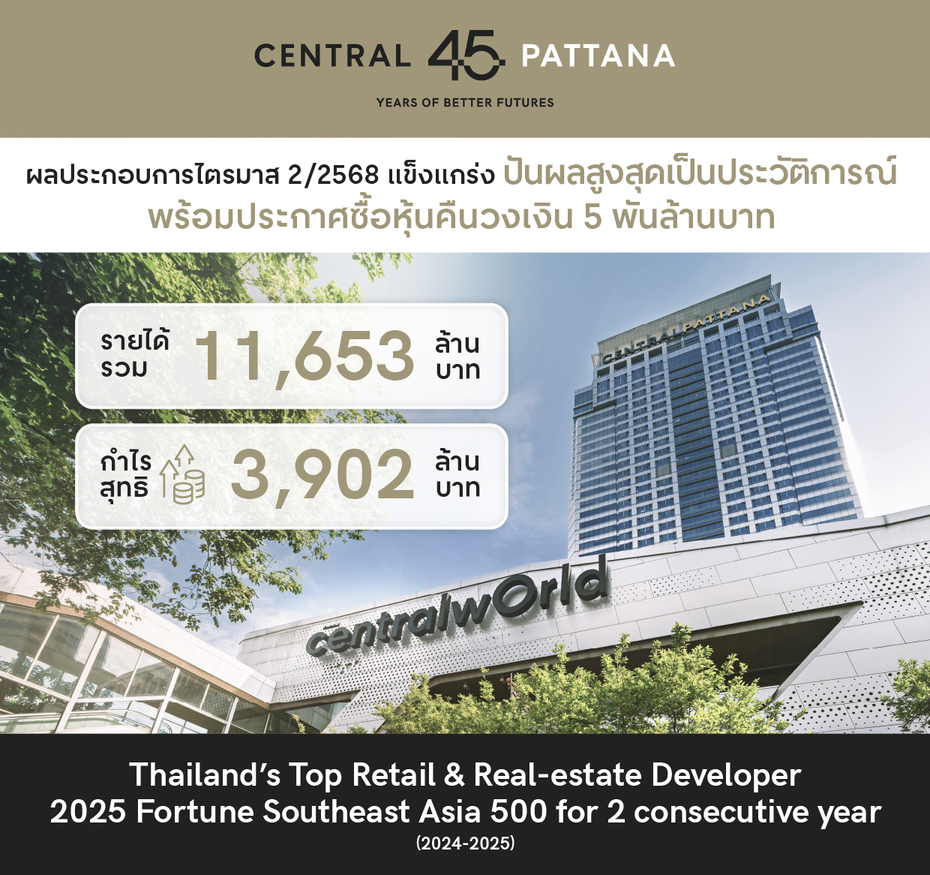 “เซ็นทรัลพัฒนา” โชว์ไตรมาส 2/2568 ผลประกอบการแข็งแกร่ง