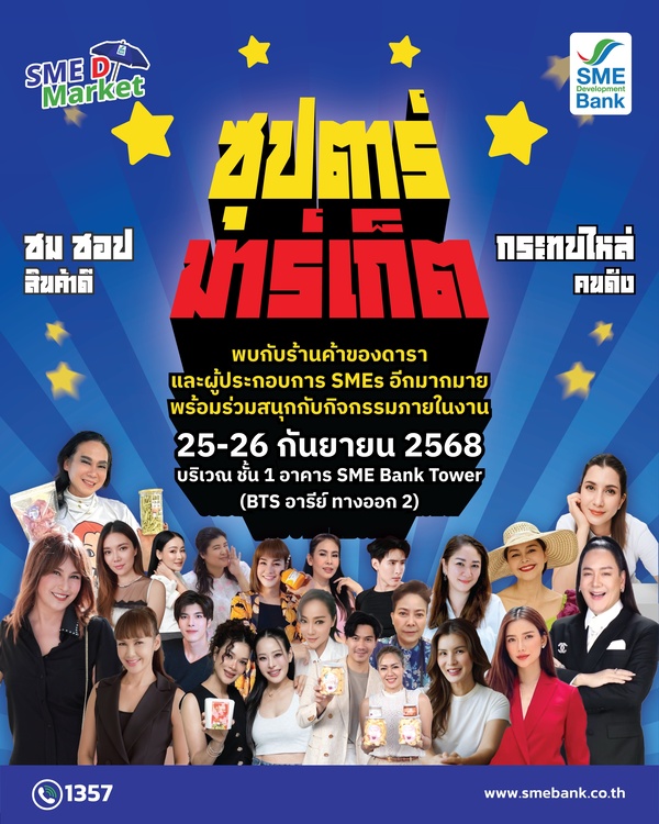 ธนาคารพัฒนาวิสาหกิจขนาดกลางและขนาดย่อมแห่งประเทศไทย (ธพว.) หรือ SME D Bank จัดกิจกรรมช่วยผู้ประกอบการเอสเอ็มอีเพิ่มรายได้ ขยายตลาด ปลุกกำลังซื้อ ขับเคลื่อนเศรษฐกิจไทยให้คึกคัก ในงาน “SME D Market” จัดระหว่ างวันที่ 25-26 กันยายน 2568 ณ หน้าอาคาร และบริเวณชั้น 1 อาคาร SME Bank Tower สำหรับเดือนนี้ จัดภายใต้ธีม “ซุปตาร์มาร์เก็ต แท็กทีมหนุนเอสเอ็มอีไทย” ยกขบวนคนดัง ทั้งดารา นักแสดง มาร่วมออกบูธจำหน่ายสินค้า เพื่อสร้างแรงบันดาลใจในการทำธุรกิจ เปิดมุมมองการเป็นผู้ประกอบการ รวมถึง สร้างสีสันกระตุ้นส่งเสริมการตลาดให้ผู้ประกอบการเอสเอ็มอี เช่น “ภารดี ผลไม้แซ่บ สะท้านทรัพย์” คุณเปิ้ล ภารดี วงษ์สวัสดิ์, “หมี่คลุก Nina by Monster” โดยคุณฮาน่า ทัศนาวลัย , “เกี๊ยวซ่าต้าร์เตอร์พรีเมี่ยม” คุณกีตาร์ ศิริพิชญ์ วิมลโนช , “ฉ่ำ ข้าวแต๋นน้ำแตงโม” คุณอนุสรา วันทองทักษ์ (เปรี้ยว AF) “ข้าวหน้าไส้อั่ว หมูฝอย” คุณเกด ธิญาดา พรรณบัว และ “ครัวป้าโก้” คุณโก้ – ธีรศักดิ์ พันธุจริยา เป็นต้น
