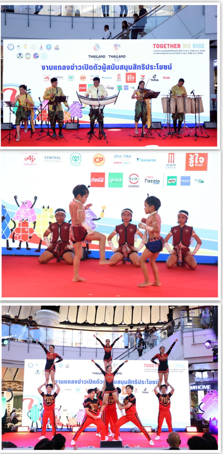 การกีฬาแห่งประเทศไทย (กกท.) จัดงาน “Together We Rise” การแถลงข่าวเปิดตัวผู้สนับสนุนสิทธิประโยชน์การแข่งขันกีฬาซีเกมส์ ครั้งที่ 33 และกีฬาอาเซียนพาราเกมส์ ครั้งที่ 13 อย่างเป็นทางการ ณ ลานเซ็นทรัลคอร์ท ชั้น 1 ศูนย์การค้าเซ็นทรัลเวิลด์ กรุงเทพฯ โดยมี ดร.ก้องศักด ยอดมณี ผู้ว่าการการกีฬาแห่งประเทศไทย เป็นประธานในพิธี พร้อมด้วย นายชลิตรัตน์ จันทรุเบกษา รองเลขาธิการคณะกรรมการโอลิมปิกแห่งประเทศไทย ในพระบรมราชูปถัมภ์ พันเอกหญิง ดร.วันดี โตสุวรรณ เลขาธิการสหพันธ์กีฬาคนพิการแห่งอาเซียน ดร.กิตติพงษ์ โพธิมู รองประธานคณะกรรมการพาราลิมปิกแห่งประเทศไทย คณะผู้บริหารการกีฬาแห่งประเทศไทย ผู้แทนองค์กรผู้สนับสนุนกว่า 20 แห่ง แขกผู้มีเกียรติ และสื่อมวลชนเข้าร่วมอย่างคับคั่ง