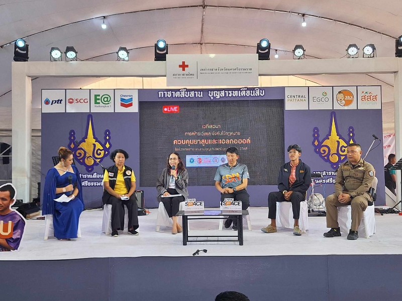 จังหวัดนครศรีธรรมราช ร่วมกับสำนักงานกองทุนสนับสนุนการสร้างเสริมสุขภาพ (สสส.) เครือข่ายองค์กรงดเหล้า หน่วยงานสาธารณสุข ศึกษาธิการ ภาคีเครือข่ายเยาวชน เครือข่ายเหยื่อเมาแล้วขับ ตำรวจ และคณะทำงานเหล่ากาชาด ได้จัดเวทีเสวนา “การเฝ้าระวัง ควบคุมยาสูบและเครื่องดื่มแอลกอฮอล์ ในเทศกาลและงานบุญประเพณีสารทเดือนสิบ ประจำปี 2568” ณ เวทีกาชาดงานสารทเดือนสิบ (ทุ่งท่าลาด) เพื่อร่วมกันขับเคลื่อนมาตรการเฝ้าระวังและสร้างพื้นที่งานบุญปลอดภัยจากปัจจัยเสี่ยง