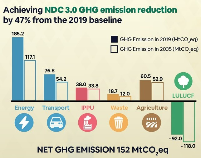 นายสุชาติ ชมกลิ่น รองนายกรัฐมนตรีและรัฐมนตรีว่าการกระทรวงทรัพยากรธรรมชาติและสิ่งแวดล้อม (รมว.ทส.) เปิดเผยว่า คณะรัฐมนตรี (ครม.) เมื่อวันที่ 4 พฤศจิกายน 2568 มีมติเห็นชอบต่อร่างเป้าหมายการมีส่วนร่วมที่ประเทศกำหนด ฉบับที่ 2 (NDC 3.0) ซึ่งเป็นก้าวสำคัญในการเร่งเป้าหมาย Net Zero ให้เร็วขึ้น 15 ปี เพื่อให้สอดคล้องกับ 1.5 ºC Pathway ตามนโยบายของรัฐบาลข้อ 13 การผลักดันสังคมคาร์บอนต่ำ ที่นายกรัฐมนตรีอนุทิน ชาญวีรกูล แถลงต่อรัฐสภา โดยมุ่งลดการปล่อยก๊าซเรือนกระจกในทุกภาคส่วนของเศรษฐกิจ (Economy-wide) ณ ปี ค.ศ. 2035 (พ.ศ. 2578) และเร่งเพิ่มเป้าหมายการดูดกลับก๊าซเรือนกระจกในภาคป่าไม้และการใช้ประโยชน์ที่ดิน (LULUCF) ซึ่งจะทำให้ประเทศไทยมีระดับการปล่อยก๊าซเรือนกระจกสุทธิ 152 MtCO2eq หรือลดลงร้อยละ 47 จากระดับการปล่อยก๊าซเรือนกระจกในปี ค.ศ. 2019 รวมถึงได้จัดทำแผนการลงทุนเพื่อดึงเม็ดเงินจากต่างประเทศ 230,000 ล้านบาท ในการสนับสนุนไทยลดก๊าซเรือนกระจก 32.8 MtCO2eq ตามเงื่อนไขของความตกลงปารีส