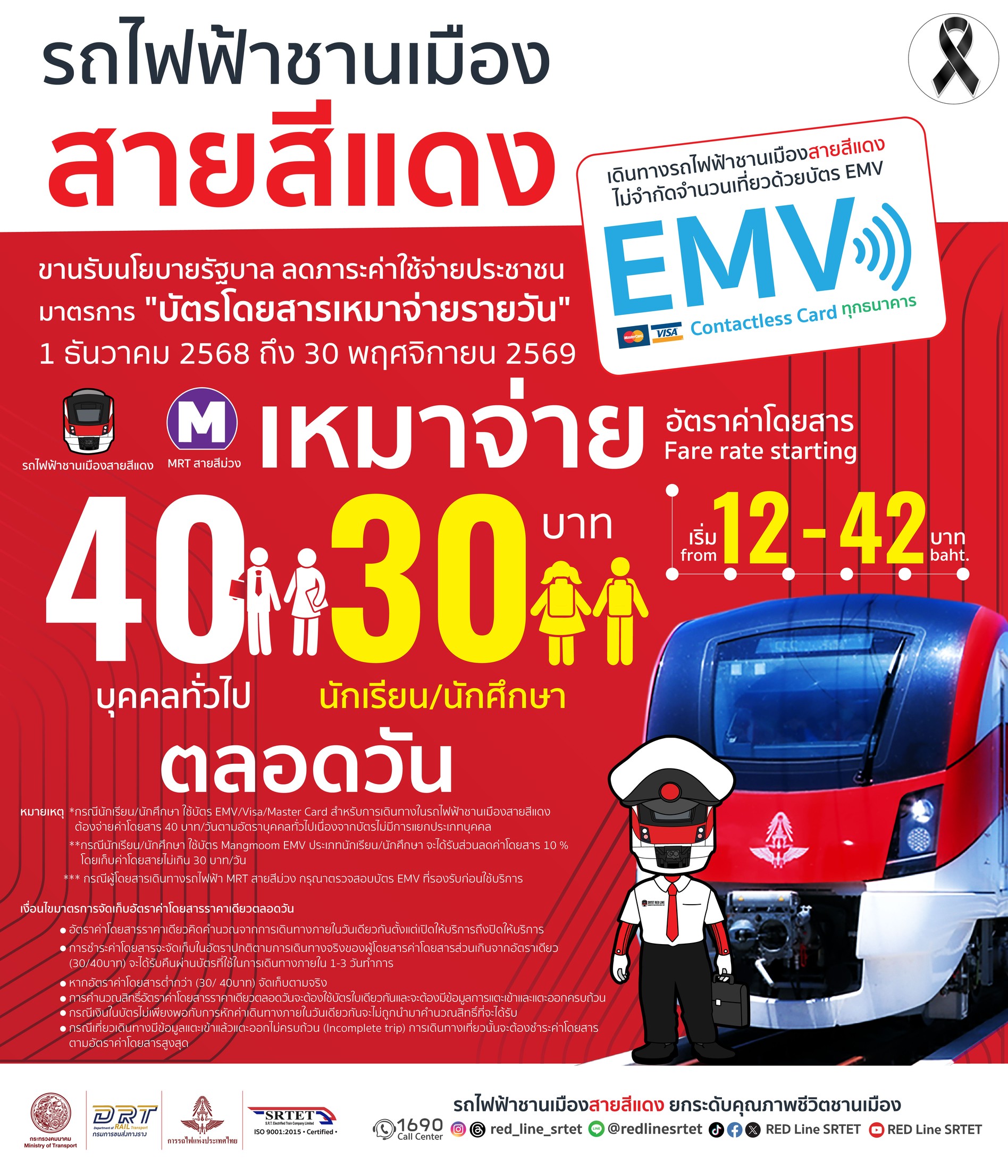โดยท่านสามารถติดตามรายละเอียดได้ทาง โซเชียลมิเดียทุกแพลตฟอร์ม Facebook Fan Page, Twitter , Instagram, Youtube, Tiktok พิมพ์ชื่อ “RED Line SRTET” หรือส่วนบริการลูกค้า 1690 ตลอด 24 ชั่วโมง และ www.srtet.co.th