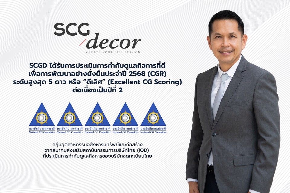 SCG Decor หรือ SCGD ได้รับการประเมินการกำกับดูแลกิจการที่ดี เพื่อการพัฒนาอย่างยั่งยืนประจำปี 2568 (CGR) ระดับสูงสุด 5 ดาว หรือ “ดีเลิศ” (Excellent CG Scoring) กลุ่มอุตสาหกรรมอสังหาริมทรัพย์และก่อสร้าง ต่อเนื่องเป็นปีที่ 2 จากสมาคมส่งเสริมสถาบันกรรมการบริษัทไทย (IOD) ที่ประเมินการกำกับดูแลกิจการของบริษัทจดทะเบียนไทย ประจำปี 2568 ตอกย้ำความมุ่งมั่นในการดำเนินธุรกิจด้วยความโปร่งใส เป็นธรรม รับผิดชอบต่อสังคม เพื่อขับเคลื่อนการเติบโตอย่างยั่งยืน