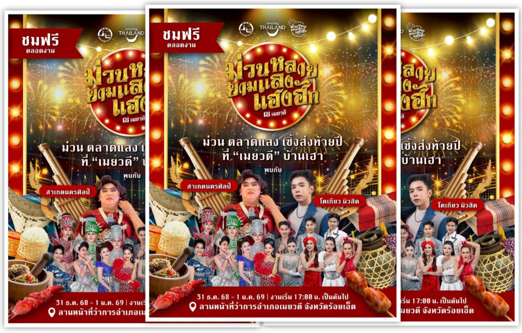 การท่องเที่ยวแห่งประเทศไทย (ททท.) ร่วมกับพันธมิตร และเครือข่ายชุมชนในพื้นที่อำเภอเมยวดี จังหวัดร้อยเอ็ด จัดกิจกรรมส่งเสริมการท่องเที่ยวเชิงวัฒนธรรมและการท่องเที่ยวชุมชน ภายใต้งาน“ม่วนหลาย ยามแลง แฮงฮัก ณ เมยวดี” ระหว่างวันที่ 31 ธันวาคม 2568 ถึง 1 มกราคม 2569 ณ ลานหน้าที่ว่าการอำเภอเมยวดี จังหวัดร้อยเอ็ด เพื่อสร้างบรรยากาศการท่องเที่ยวช่วงเทศกาลปีใหม่ ควบคู่กับการส่งเสริมอัตลักษณ์ท้องถิ่นและกระตุ้นเศรษฐกิจชุมชนอย่างยั่งยืน