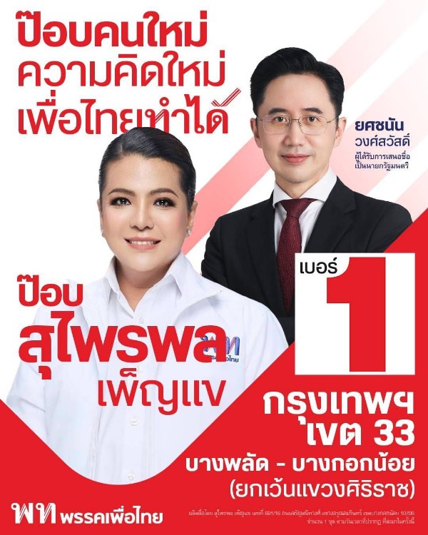 29 ธันวาคม 2568 -นายสุไพรพล เพ็ญแข หรือ “ป๊อบ” ผู้สมัครสมาชิกสภาผู้แทนราษฎร เขตบางพลัด–บางกอกน้อย พรรคเพื่อไทย เปิดเผยถึงแนวทางการรณรงค์หาเสียงว่า ตนและนายจักรภพ เพ็ญแข คู่ชีวิต มีความเห็นตรงกันในการเลือกใช้ป้ายหาเสียงขนาดเล็ก คล้ายรูปแบบที่ผู้ว่าราชการกรุงเทพมหานคร นายชัชชาติ สิทธิพันธุ์ เคยใช้ เนื่องจากมีขนาดกะทัดรัด ให้ข้อมูลครบถ้วน ใช้งบประมาณน้อย และไม่กีดขวางการสัญจรหรือรบกวนสายตาประชาชนบนทางเท้า