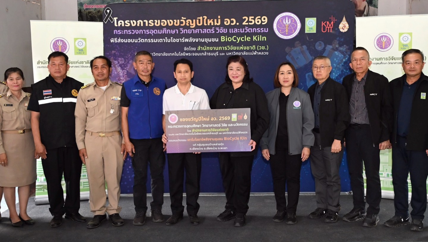 ดร.วิภารัตน์ ดีอ่อง ผู้อำนวยการสำนักงานการวิจัยแห่งชาติ กล่าวว่า อว.ได้จัดทำโครงการของขวัญปีใหม่ 2569 ซึ่ง วช.ได้ร่วมมอบนวัตกรรมเพื่อการใช้ประโยชน์ให้กับพื้นที่ ผ่านนวัตกรรมเตาไบโอชาร์พลังงานชุมชน BioCycle Kiln โดยสนับสนุนให้มหาวิทยาลัยเทคโนโลยีพระจอมเกล้าธนบุรีร่วมกับมหาวิทยาลัยแม่ฟ้าหลวง ร่วมพัฒนานวัตกรรมดังกล่าว ควบคู่ไปกับการถ่ายทอดองค์ความรู้ด้านการใช้งานสู่ชุมชน เพื่อให้สามารถนำเทคโนโลยีไปประยุกต์ใช้ในการจัดการเศษวัสดุเหลือทิ้ง ทางการเกษตรได้อย่างมีประสิทธิภาพ ลดปัญหามลพิษ PM2.5 พร้อมส่งเสริมให้ชุมชนสามารถพึ่งพาตนเองด้านเทคโนโลยี ต่อยอดการใช้ประโยชน์เชิงเศรษฐกิจและสิ่งแวดล้อม อันจะนำไปสู่การพัฒนาคุณภาพชีวิตของประชาชนและความเข้มแข็งของชุมชน