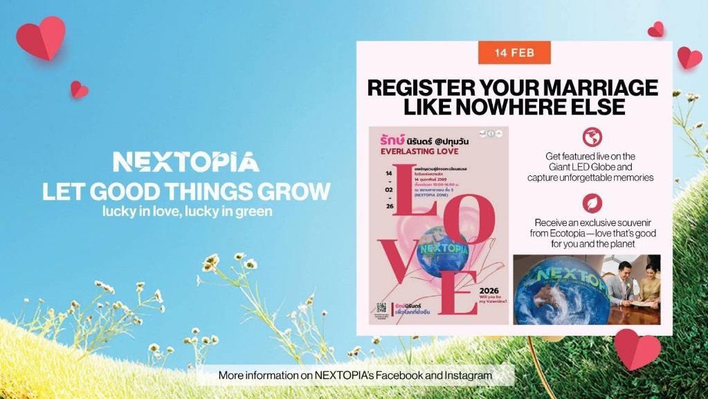 NEXTOPIA ร่วมกับสำนักงานเขตปทุมวัน ชวนคู่รักจดทะเบียนสมรส 14 ก.พ.นี้ เติมความหวานเสริมความปัง รับวาเลนไทน์ – ตรุษจีน ไปกับ “Lucky in Love, Lucky in Green”