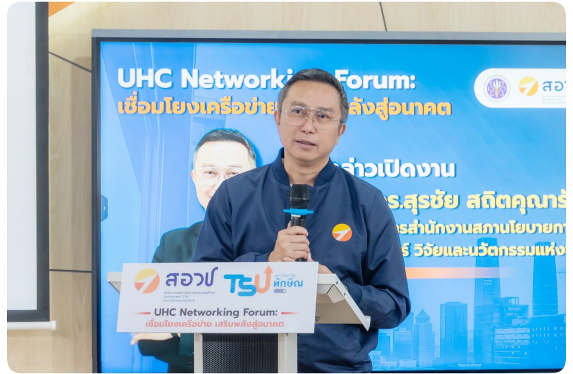 “บทบาทของ สอวช. ในการผลักดัน UHC ไม่ได้จำกัดอยู่เพียงการสนับสนุนเชิงแนวคิด แต่ครอบคลุมถึงการออกแบบนโยบายและแนวทางปฏิบัติให้มหาวิทยาลัยใช้เป็นกรอบจัดตั้งและดำเนินงาน การผลักดันการปรับปรุงระเบียบที่เกี่ยวข้องเพื่อปลดล็อกข้อจำกัดด้านการร่วมลงทุน ตลอดจนการจัดกิจกรรม UHC Learn & Share และการสร้างเครือข่าย UHC Network เพื่อแลกเปลี่ยนประสบการณ์และพัฒนามาตรฐานการดำเนินงานร่วมกัน” ผู้อำนวยการ สอวช. กล่าว
