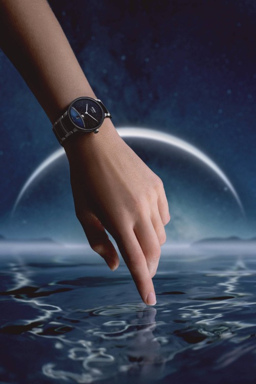 อีกส่วนหนึ่งของหน้าปัดรังสรรค์จากหินอะเวนทูรีน ซึ่งให้ประกายระยิบระยับราวกับหมู่ดาวที่กระจายอยู่ทั่วกาแล็กซี เหนือเส้นขอบฟ้า คือฟังก์ชันแสดงข้างขึ้นข้างแรม ซึ่งถือเป็นครั้งแรกที่ Rado นำฟังก์ชันนี้มาใช้กับคอลเลกชัน Centrix โดยดวงจันทร์ได้รับการรังสรรค์ด้วยโรเดียม เพื่อให้กลมกลืนกับเข็มชั่วโมงและเข็มนาที ถ่ายทอดวัฏจักรของดวงจันทร์อย่างงดงาม ตั้งแต่ข้างขึ้นจนถึงข้างแรมในแต่ละเดือน สะท้อนความลุ่มลึกและ แรงบันดาลใจจากเรื่องเล่าแห่งพันหนึ่งราตรี