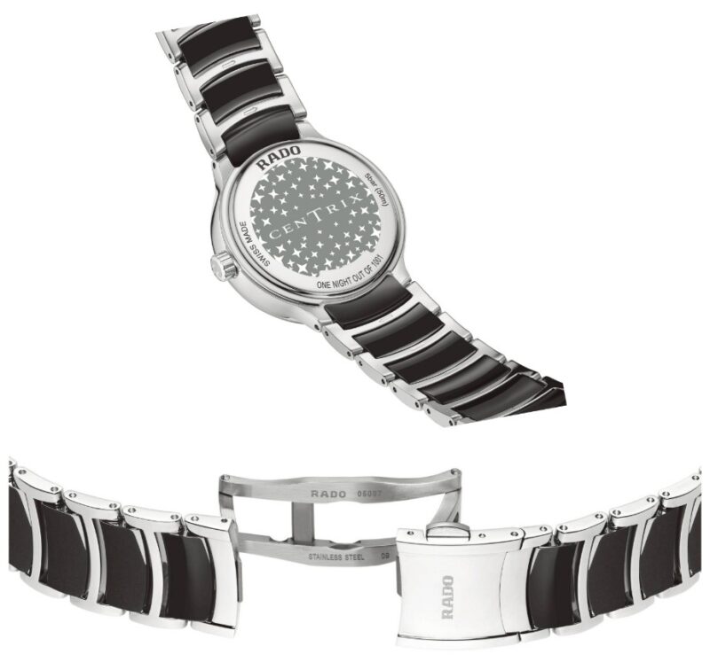 ความงดงามยังต่อเนื่องไปถึงสายที่ผสานระหว่างข้อต่อสเตนเลสสตีลและไฮเทคเซรามิกสีดำขัดเงาอันเป็นเอกลักษณ์ของ Rado ถ่ายทอดความสมดุลระหว่างความแข็งแกร่งและความสง่างามได้อย่างลงตัว