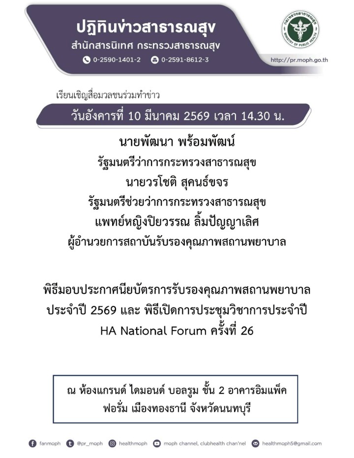 กระทรวงสาธารณสุข เชิญร่วมงานพิธีมอบประกาศนียบัตรการรับรองคุณภาพสถานพยาบาล