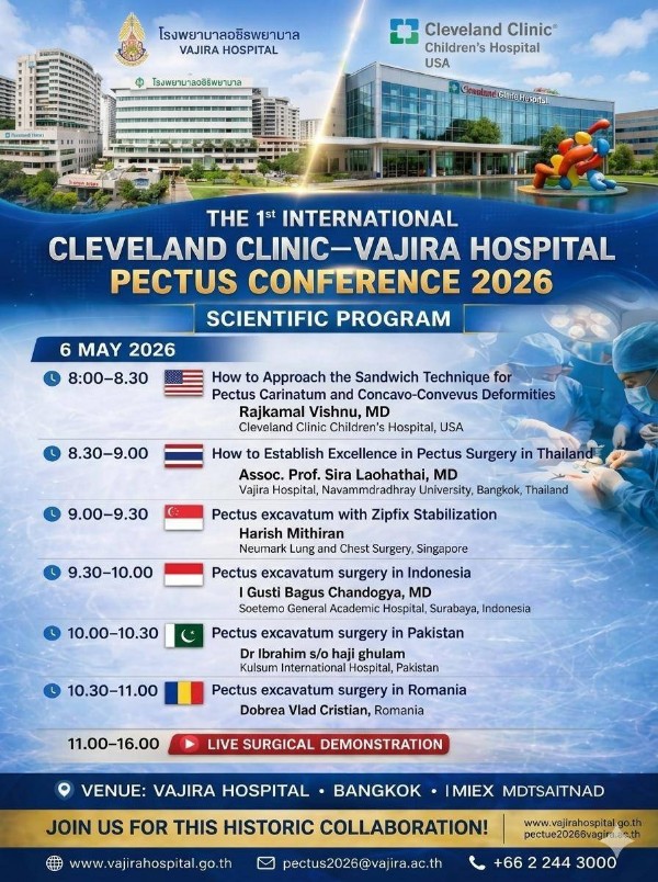 โรงพยาบาลวชิรพยาบาลเตรียมจัดงานประชุมนานาชาติด้านโรคอกบุ๋มครั้งแรกของประเทศไทย “Pectus Conference 2026” ในวันที่ 6 พฤษภาคมนี้ ร่วมกับ Cleveland Clinic Children’s Hospital ประเทศสหรัฐอเมริกา สะท้อนให้เห็นถึงความสำคัญของโรคอกบุ๋ม(Pectus Excavatum) ที่กำลังได้รับความสนใจมากขึ้นในวงการแพทย์ระดับโลก