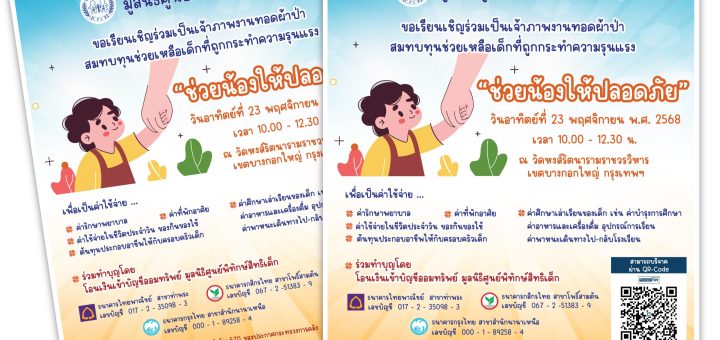 งานทอดผ้าป่า “ช่วยน้องให้ปลอดภัย” ของมูลนิธิศูนย์พิทักษ์สิทธิเด็กที่จะจัดขึ้นในวันอาทิตย์ที่ 23 พฤศจิกายน 2568 เวลา 10.00-12.30 น. ณ วัดหงส์รัตนารามราชวรวิหาร กรุงเทพฯ เพื่อนำเงินบริจาคที่ …[อ่านข่าวเพิ่มเติม]